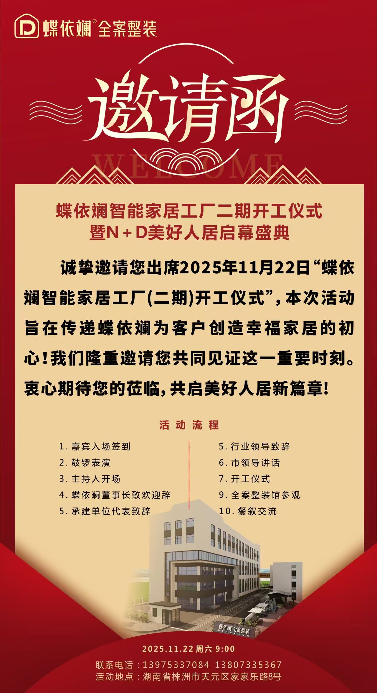 蝶依斓整装智能家居工厂(二期)项目开工仪式暨N+D美好人居启幕盛典,将于11月22日在株洲市天元区家家乐路蝶依斓家居盛大举行。届时,市领导与行业领军人物将共同出席动工仪式,见证这一重要时刻。