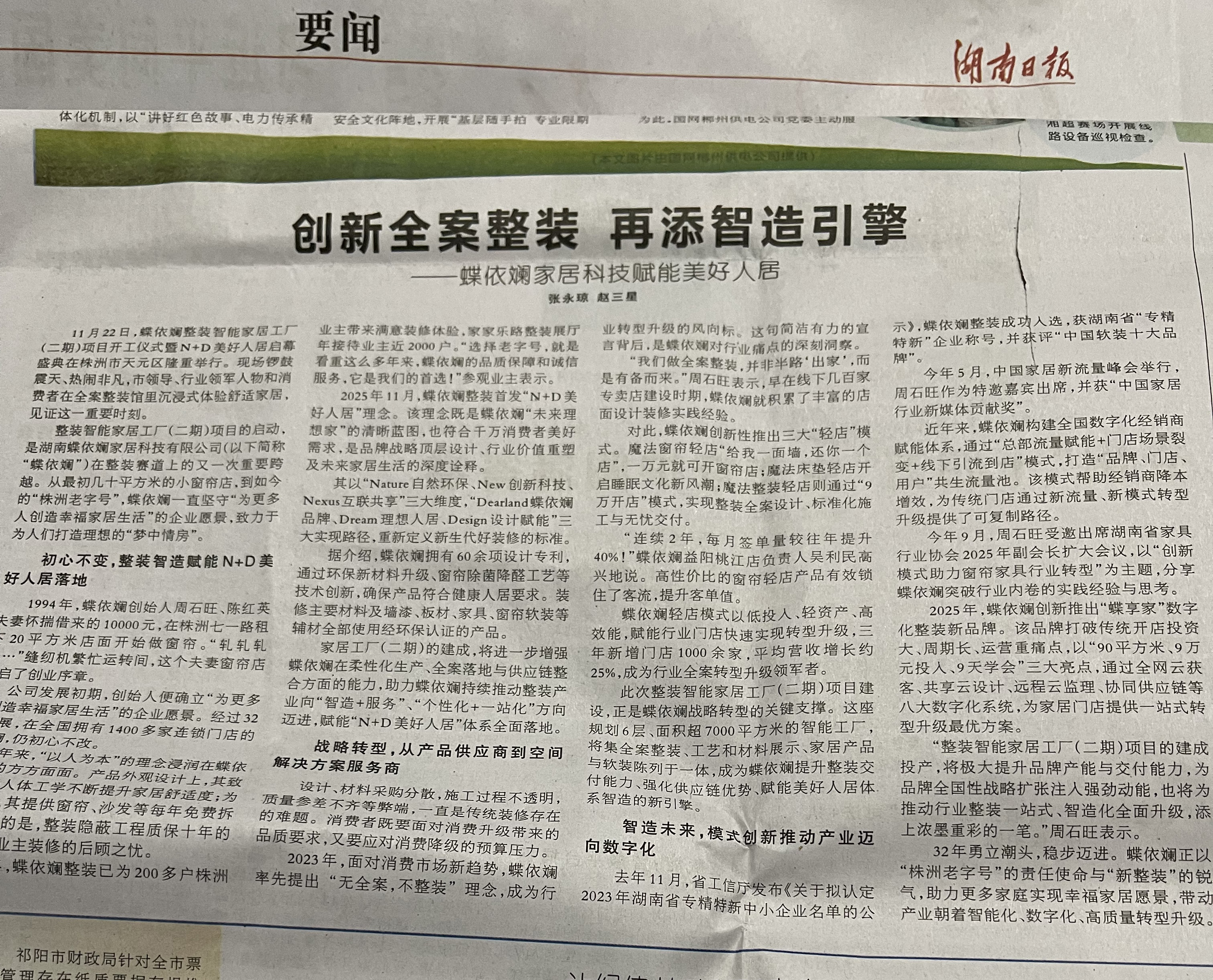 从一台缝纫机到三大智造基地,从单一窗帘、家具产品到全案整装,蝶依斓的32年,是家居行业从传统走向高质量发展的生动缩影。此次《湖南日报》以专版形式对其进行深度解读,不仅是对企业坚守长期主义的认可,更是对“湘商”创新精神与实体制造业转型路径的权威观察。在媒体聚光灯下,蝶依斓正以32年为新起点,持续书写关于坚守、创新与引领的崭新篇章。