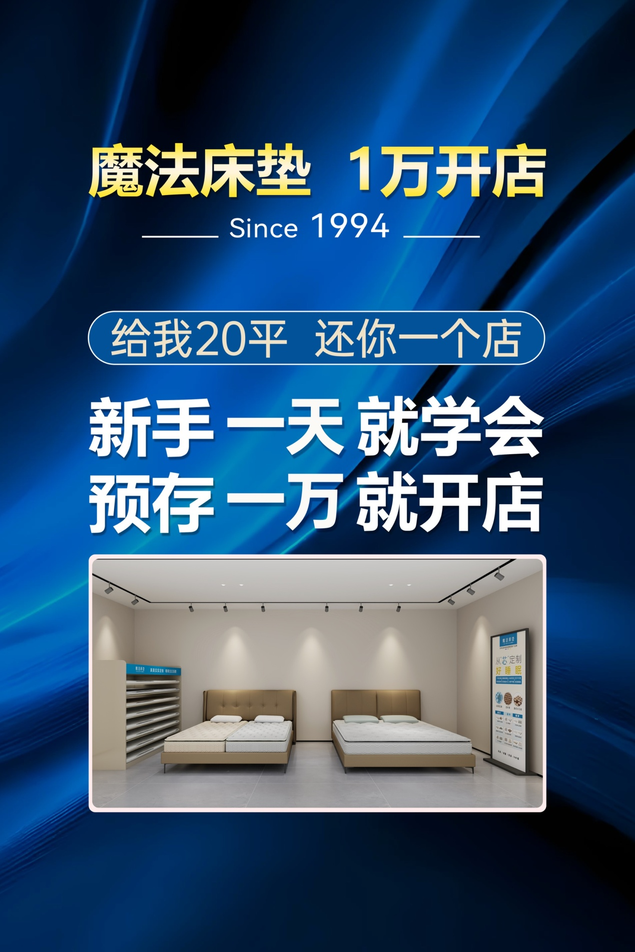 “给我20平,还你一个店”!1万元,20平米,以全拆洗、科技环保新材等产品创新卖点,满足消费者对床垫尺寸、材质、软硬度等个性化定制需求,帮助现有家居、装修门店扩充单品,搭建一站式服务。